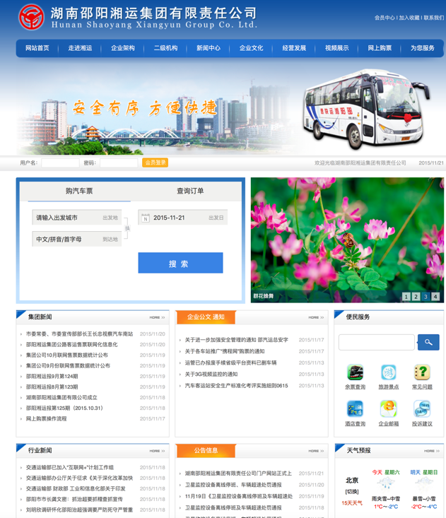 為加強企業(yè)信息化工作,利用網(wǎng)站推廣企業(yè)文化、提升內(nèi)部管理效率,湖南邵陽湘運集團有限責(zé)任公司官方網(wǎng)站域名www.sdboheng.com于11月11日通過審核,網(wǎng)站次日正式上線發(fā)布。集團公司與旗下客運子公司均有獨立版面,可發(fā)布文件信息、動態(tài)新聞等,今后集團公司的公文、通知等將在網(wǎng)上發(fā)布,各子公司在網(wǎng)上查看下載,極大提升了文件發(fā)布的效率。該網(wǎng)站最大的特點是可以查詢邵陽地區(qū)一二級車站所有車輛班次、時間、價格信息,并可在線購票,購票成功后憑密碼或身份證前往車站自動取票機(或人工售票窗口)取票,該網(wǎng)站為旅客提供了一個便捷的購票渠道。